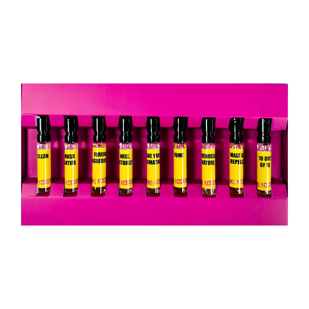 The Demo Accords Sample Set contains 2ml samples of 9* of the 10 fragrances detailed as formulas in the book.